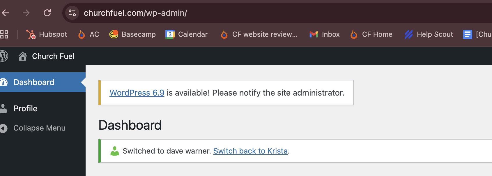 When you're finished return to Church Fuels Admin login page and look for the banner at the top of the page that says "Switch back to..." and click on your name.