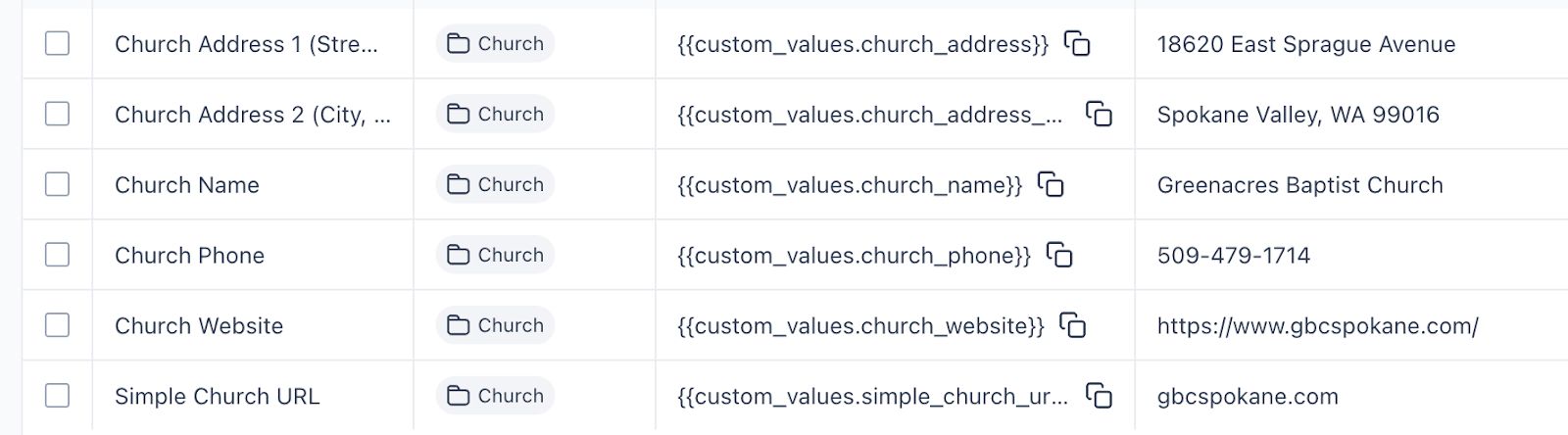 - In Search Values, type in Church. Make sure the following values are filled in: Church Address, Church Name, Church Website and Simple Church URL. You’ll come back to fill in Church Phone with the number you purchase.