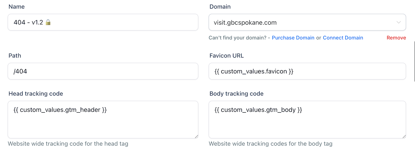 - If it’s not already filled in with the Domain, Favicon URL, Head tracking code, Body tracking code, then type in / 11 in the Favicon so it fills in the values for each. Repeat this for all 4 pages.